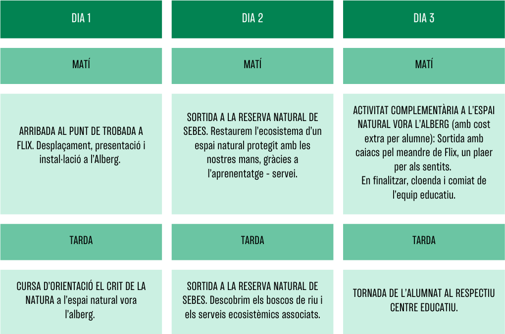 - El disseny de la seqüència didàctica està pensat per una estada de tres dies, però hi ha la possibilitat d’adaptar-la a dos dies. Finalitza el matí del tercer dia, i d’aquesta manera si es vol es pot venir amb un altre grup consecutivament (sempre que s’hagi realitzat la sol·licitud corresponent al període d’inscripció habilitat pel Departament d’Educació, i les característiques del Cda de Flix el puguin acollir). El matí del primer dia es destina a l’arribada al punt de trobada, presentació i instal·lació a l’alberg Vilar Riu de Baix. A la pestanya següent, titulada Estructura, trobareu dues imatges de l’estructura d’estada de tres dies corresponent a cada itinerari d’aprenentatge.