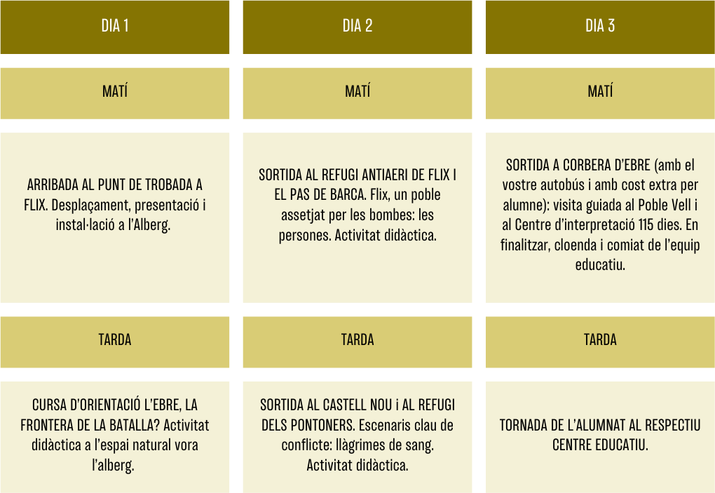 - ITINERARI D’APRENENTATGE L’EBRE, LA FRONTERA DE LA BATALLA? (es pot realitzar al mes de novembre en commemoració de l’aniversari de la fi de la Batalla de l’Ebre). Detall d’informació 1r CICLE i 2N CICLE