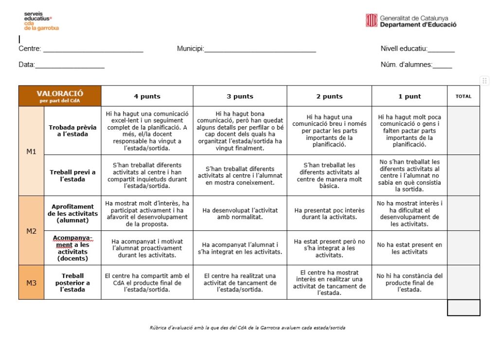 Compartim la rúbrica amb la que des del CdA de la Garrotxa valorem a cada centre que realitza activitats amb nosaltres: