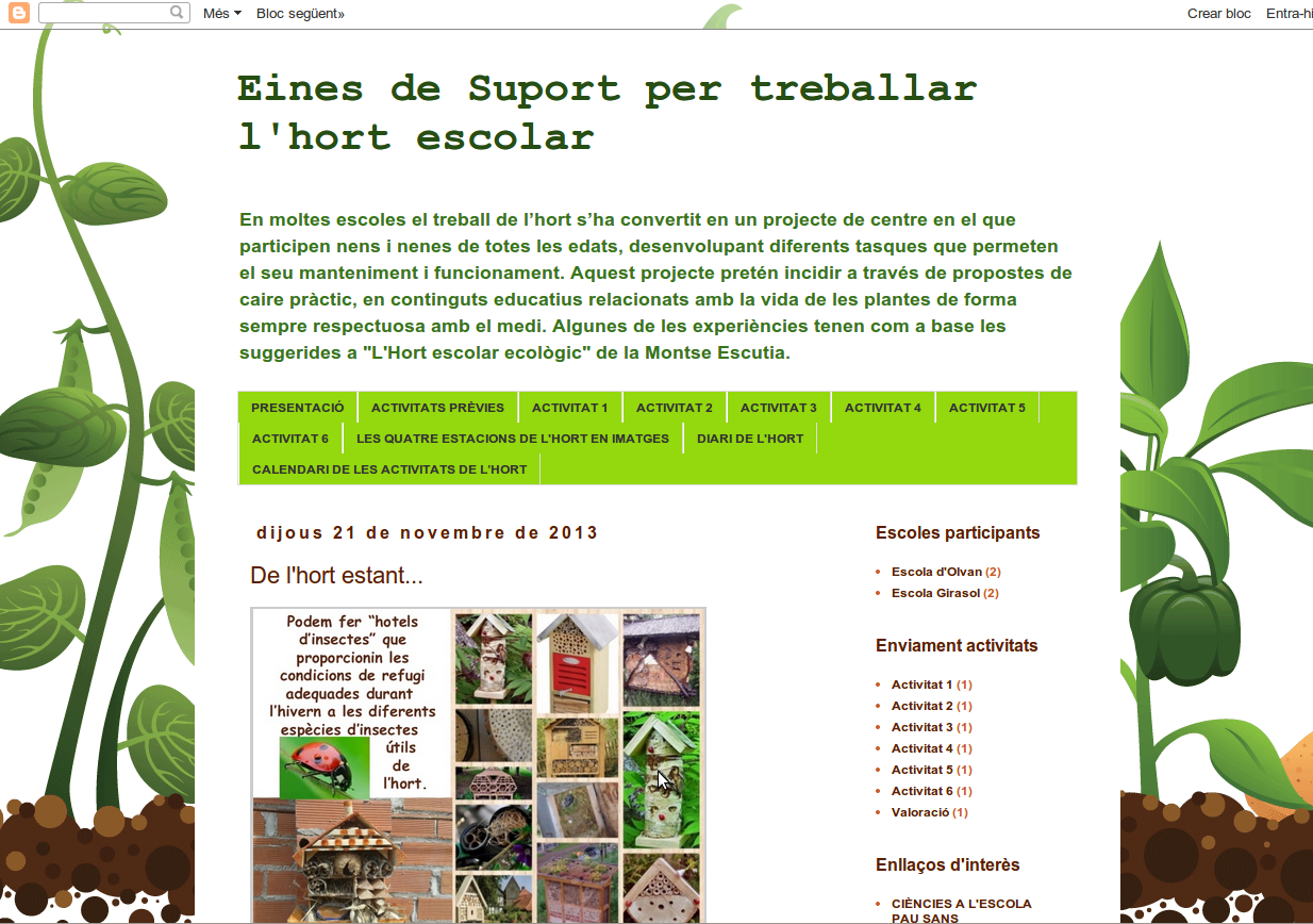 Aquest projecte pretén incidir a través de propostes de caire pràctic, en continguts educatius relacionats amb la vida de les plantes de forma sempre respectuosa amb el medi. Algunes de les experiències tenen com a base les suggerides a “L’Hort escolar ecològic” de la Montse Escutia. Enllaç al projecte.