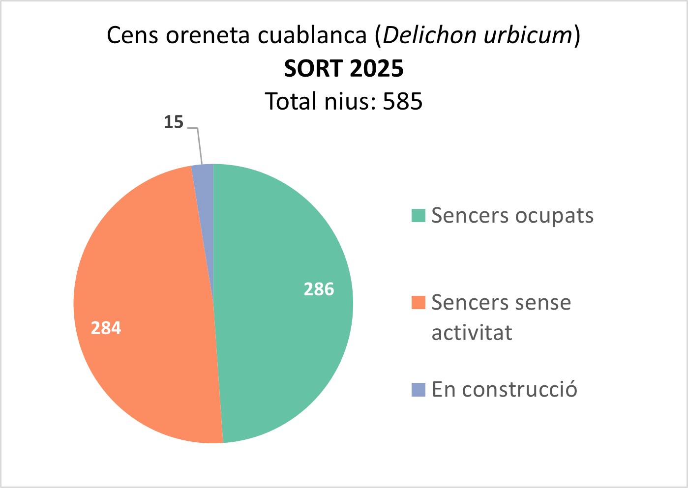 Enguany, hem comptabilitzat un total de 585 nius sencers i en bon estat repartits pels carrers del municipi. D’aquests, 286 es trobaven ocupats amb orenetes adultes entrant i sortint per alimentar els seus polls, un indici clar d’activitat reproductiva.