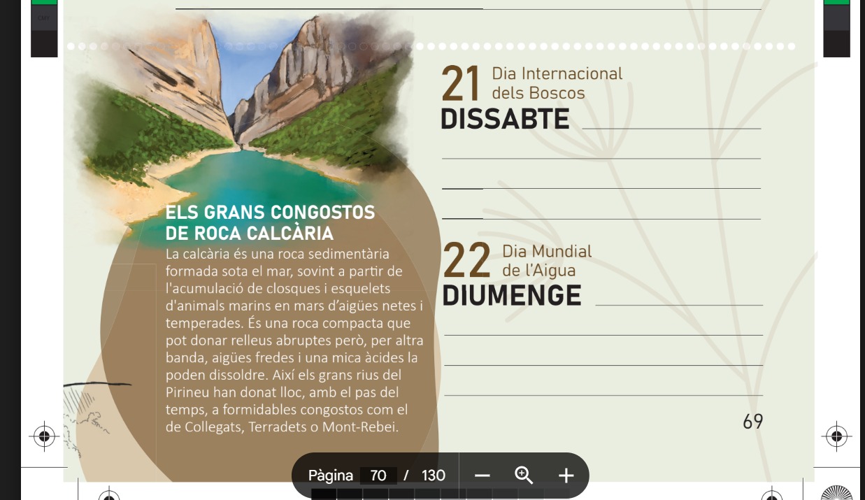 Es tracta d’una agenda escolar destinada a fomentar l’educació ambiental i la pertinença al territori. L’agenda inclou informació sobre els espais naturals protegits del Pirineu, així com de les activitats educatives que ofereixen. Cada setmana els infants, famílies i docents podran llegir una curiositat del medi natural i treballar sobre algun dels reptes ambientals que proposa l’agenda.