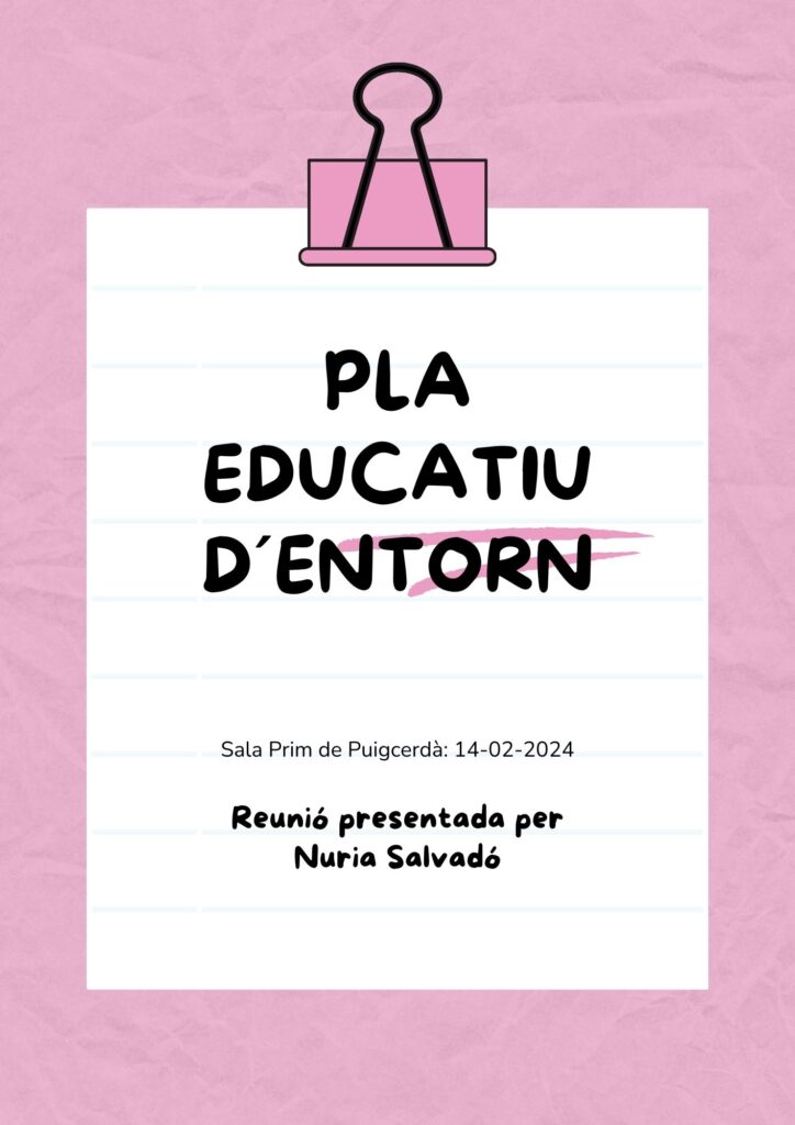 Ahir, 14 de febrer del 2024 hi va haver la reunió per formalitzar les comissions del pla educatiu d´entorn de Puigcerdà. Aquestes són les següents: COMISSIÓ REPRESENTATIVA-INSTITUCIONAL COMISSIÓ OPERATIVA COMISSIONS PARTICIPATIVES O GRUPS DE TREBALL: – Llengua i cultura catalana – Esports – Servei comunitari – Propostes d’estiu COMISSIÓ REPRESENTATIVA-INSTITUCIONAL Presidència: Alcalde o regidora d’Educació