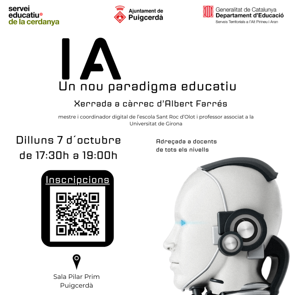 El proper dilluns 7 d’octubre l’Albert Farrés ens farà una xerrada sobre intel·ligència artificial en el món educatiu. L’Albert és mestre en una escola d’Olot i formador de robòtica i altres formacions digitals. Podeu fer la inscripció clicant a l’enllaç. INSCRIPCIONS Aquesta activitat és certificable dins l’activitat I Compartim i reflexionem: Cicle de conferències. […]