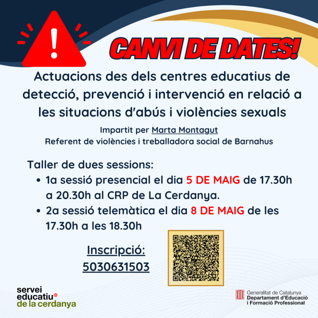 Us convidem al taller formatiu que es durà a terme el dia 7 d’abril a la sala d’actes de l’INS Pere Borrell on parlarem de com “Acompanyar el dol als centres educatius” amb l’equip de professionals del programa Benestar per estar Bé (BXB). INSCRIPCIONS Dia: 7 d’abril de 2025 Hora: 17.30h-19h Lloc: Sala d’actes de […]