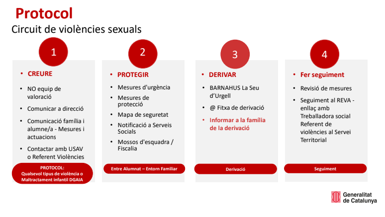 En aquesta sessió vam poder veure les dades actuals del nostre territori pel que fa a casos de violència a l’alumnat i vam conèixer el protocol a seguir en el cas que un alumne ens faci una revelació en l’àmbit escolar.