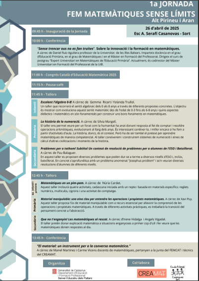 Una iniciativa pensada per a docents d’educació infantil, primària i secundària de l’Alt Pirineu i Aran que vulguin aprofundir en noves estratègies i metodologies per a l’ensenyament de les matemàtiques.