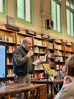 Seguidament, hi ha hagut un petit col·loqui sobre el llibre Les bibliotecàries. Diari de la Biblioteca Popular del Pere Vila 1933-1939. Núria Mulé ens ha explicat com ara fa més de 20 anys, fent una suplència de la bibliotecària, va descobrir els antics diaris de la biblioteca i la lectura dels textos la va captivar.  També ha  participat l’editor del llibre i  Elisa Pereza, il·lustradora del llibre i ex-alumna de l’Escola Pere Vila. El llibre es va aconseguir editar gràcies a una campanya de micromecenatge.  El diari escrit per Rosa Sarrado i Concepció Múnera, recull les tasques quotidianes de la biblioteca i ens permet aproximar-nos a aspectes com les preferències lectores de l’època, les relacions entre el personal bibliotecari i els lectors, i aporta molta informació sobre el context polític i social de l’època. Trobem fragments que es parlen dels bombardejos, joves que marxen al front, i com afecta la guerra als lectors. Aquest és un exemple de les notes que hi trobem: