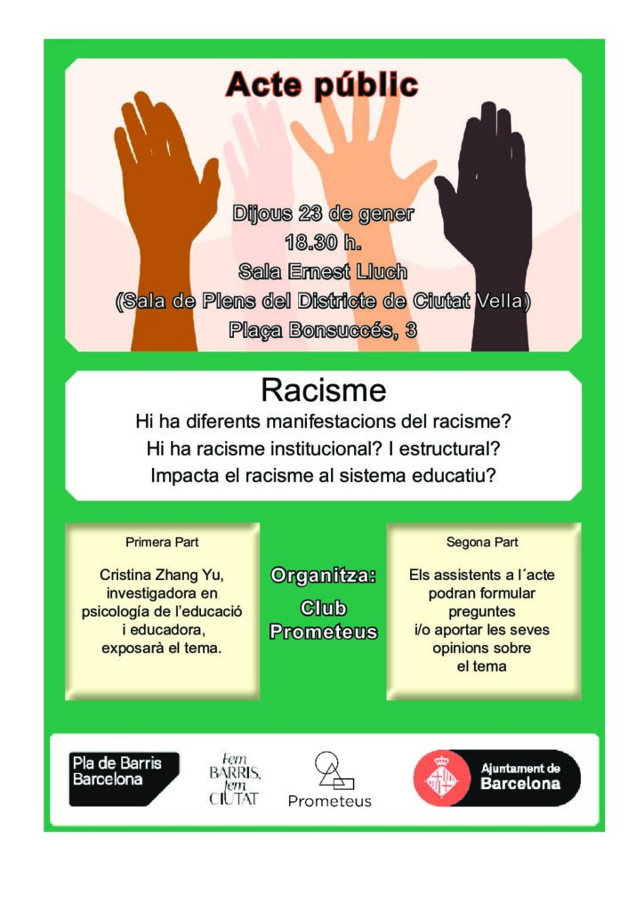 Convocatòria per a l’acte sobre el Racisme organitzat pel “Club Prometeus” El proper dijous 23 de gener de 2025, a les 18.30 h, tindrà lloc a la Sala Ernest Lluch (Districte de Ciutat Vella) un acte públic dedicat a debatre sobre el racisme, especialment des de la perspectiva educativa. L’acte, organitzat pel Club Prometeus, comptarà […]