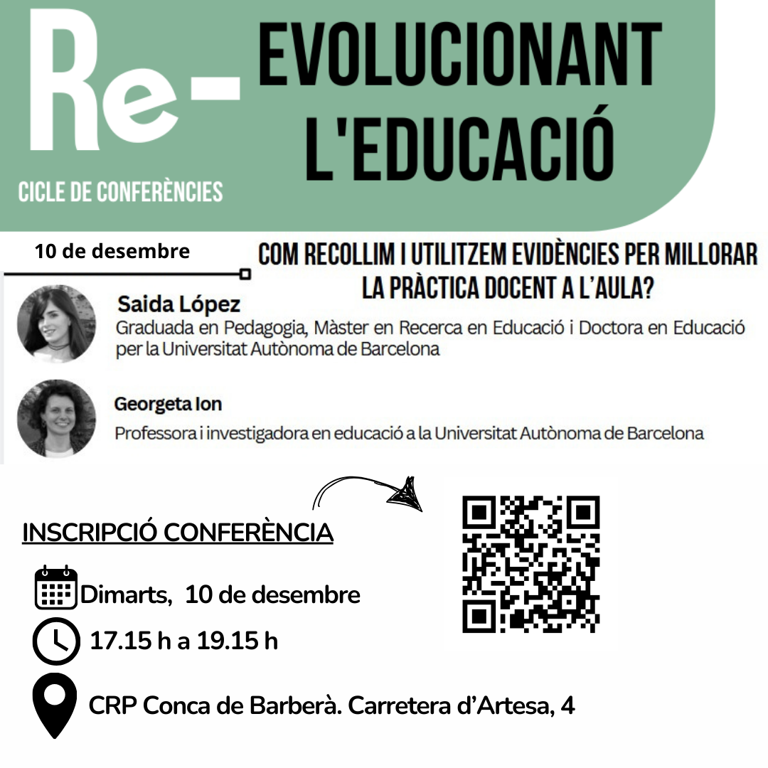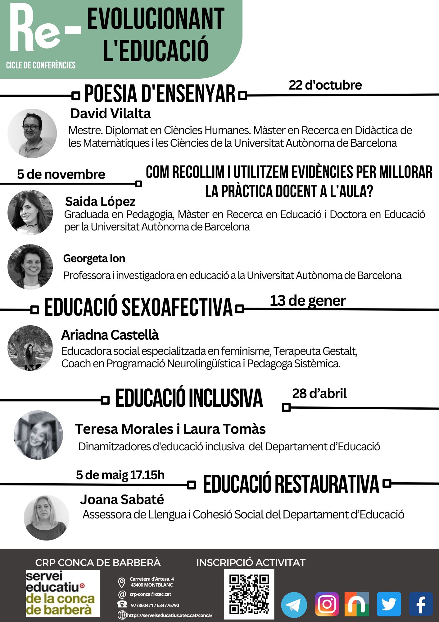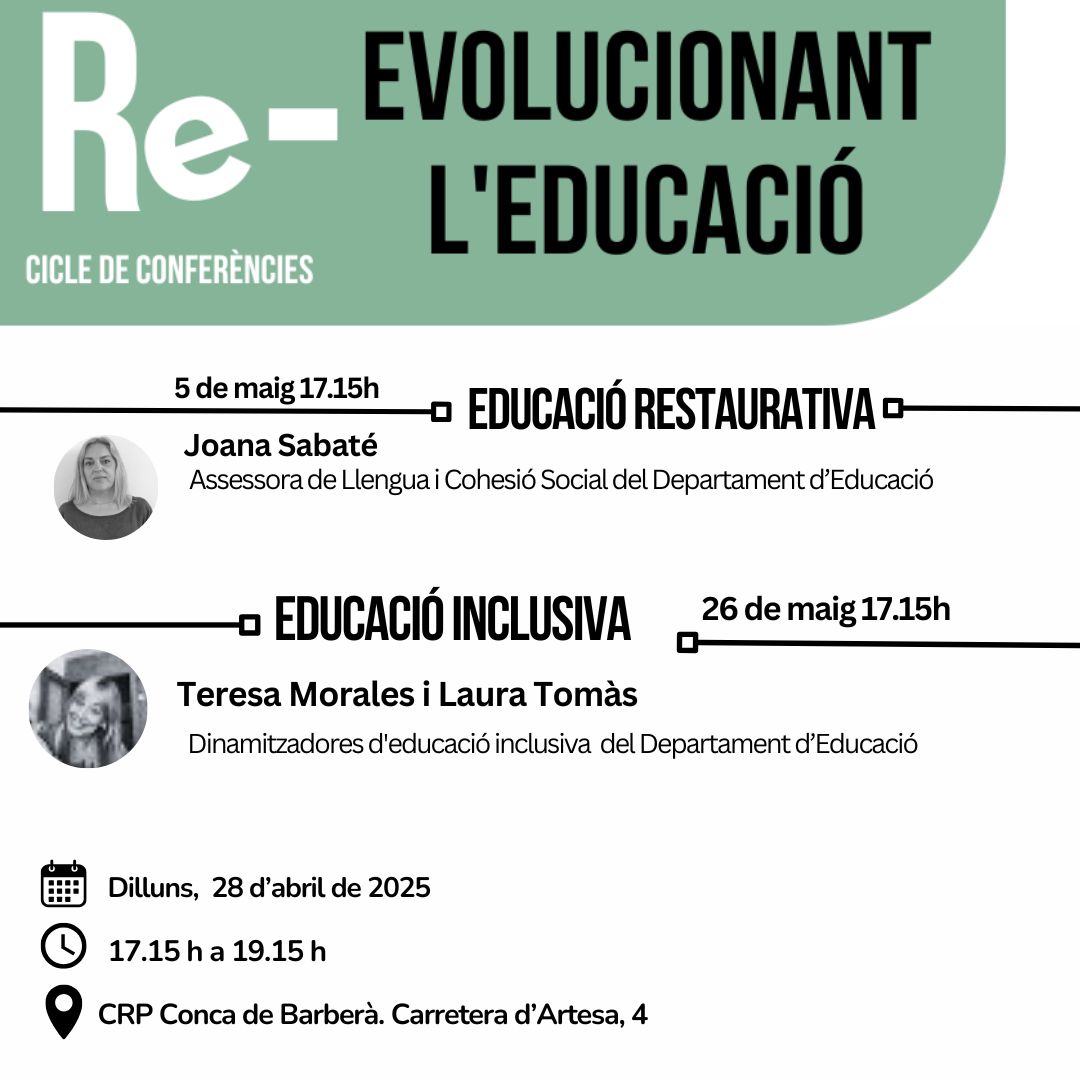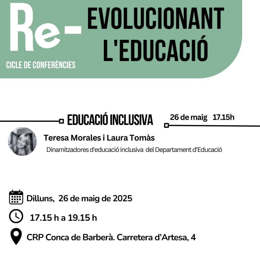 Us informem que el dilluns 26 de maig a les 17.15 h es realitzarà la següent conferència de l’activitat formativa Re-evolucionant l’educació al CRP Conca de Barberà de Montblanc amb el títol ” Inclusió, cohesió a l’aula i DUA”. Aquesta conferència anirà a càrrec de Maria Teresa Morales i Laura Tomàs, dinamitzadores d’educació inclusiva DEI dels Serveis Territorials de Tarragona. Si hi ha algú del vostre claustre […]
