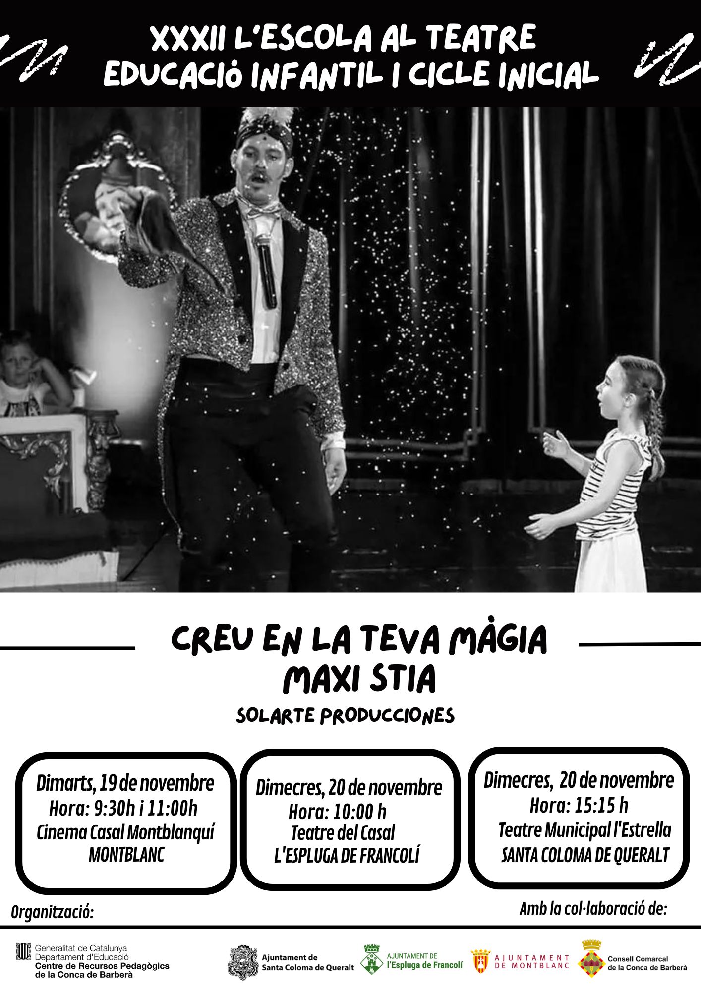 Aproximadament uns 800 alumnes d’Educació Infantil i Cicle Inicial gaudiran de l’obra “Creu en la teva màgia” de la companyia de Maxi Stia. En els dies 19 i 20 de novembre els alumnes podran gaudir d’una obra de teatre en amb representacions a Montblanc, L’Espluga de Francolí i Santa Coloma de Queralt. Podeu descarregar-vos el dossier […]