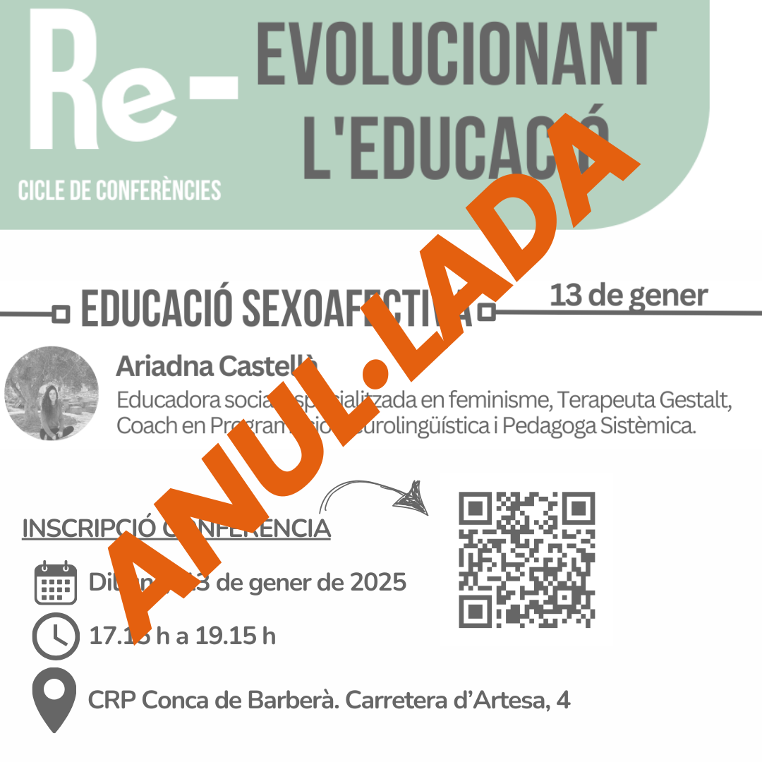 Us informem que s’ha suspès la conferència d’avui que havia de realitzar la Ariadna Castellà sobre l’Educació sexoafectiva. Tan bon punt sapiguem la nova data, us la farem saber. Perdoneu les molèsties.
