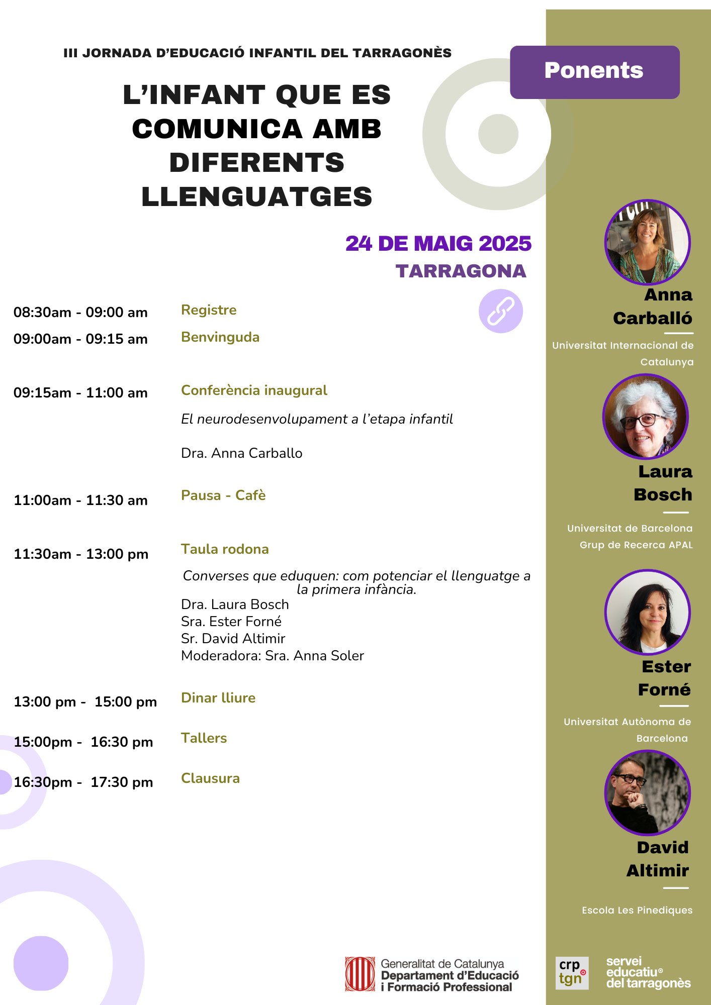 Ens fa molta il·lusió compartir amb vosaltres el programa de la III Jornada d’Educació Infantil del Tarragonès, que tindrà lloc el dissabte 24 de maig de 2025 a l’Institut Vidal i Barraquer de Tarragona. Aquesta edició es fonamenta en l’eix 2 del currículum d’infantil, “Un infant que es comunica amb diferents llenguatges”. Començarem la jornada amb una conferència inaugural sobre neurociència i educació a […]