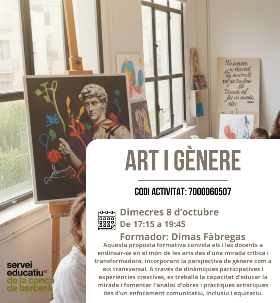 Aquest seminari vol oferir un espai de reflexió i creació compartida al voltant de la coeducació, el benestar i la perspectiva feminista en l’educació, amb l’objectiu d’impulsar una acció conjunta comarcal vinculada al Dia Internacional de les Dones (8 de març).   Enllaç inscripció   S’ofereix la possibilitat d’assistir a la càpsula “Art i gènere”