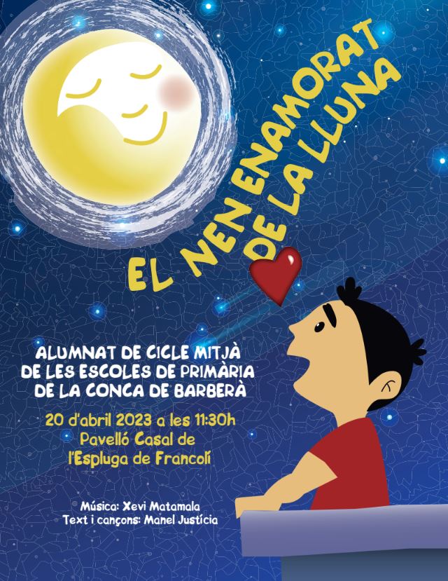 El passat 20 d’abril va tenir lloc la IX edició de l’activitat “Cantem junts” amb la cantata “El nen enamorat de la lluna” al pavelló del Casal de L’Espluga de Francolí. El nen enamorat de la lluna ha estat musicada per Xavi Matamala; i les lletres i les cançons són de Manel Justícia. Aquesta cantata és una història senzilla i tendra que s’endinsa d’una manera màgica al cor dels més petits, que es creuen tot el que s’hi explica. L’argument de la història, per si sol, ja captiva els espectadors, però si afegim la lletra i les cançons en rigorós directe, reforcen encara més aquesta poderosa empatia.