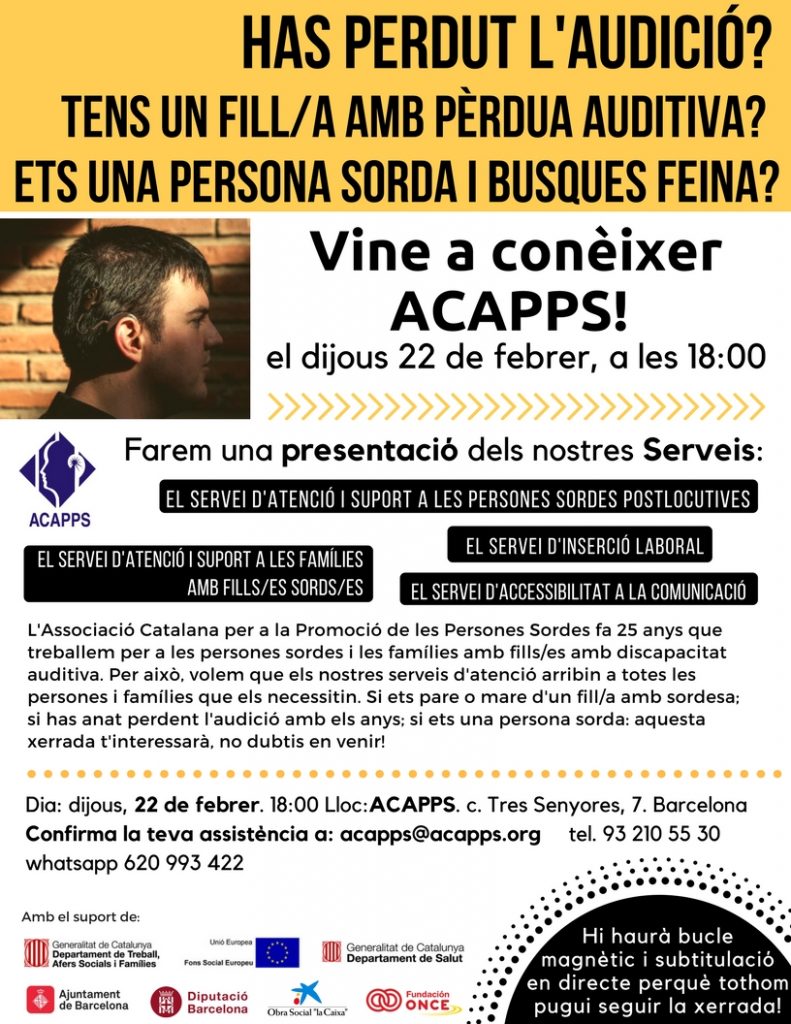 El proper dijous 22 de febrer l’Associació Catalana per a la Promoció de les Persones Sordes (ACAPPS) farà una presentació dels serveis que ofereix: el d’Atenció i Suport a les Famílies i a les persones sordes postlocutives, el d’Inserció Laboral i el d’Accessibilitat a la Comunicació.