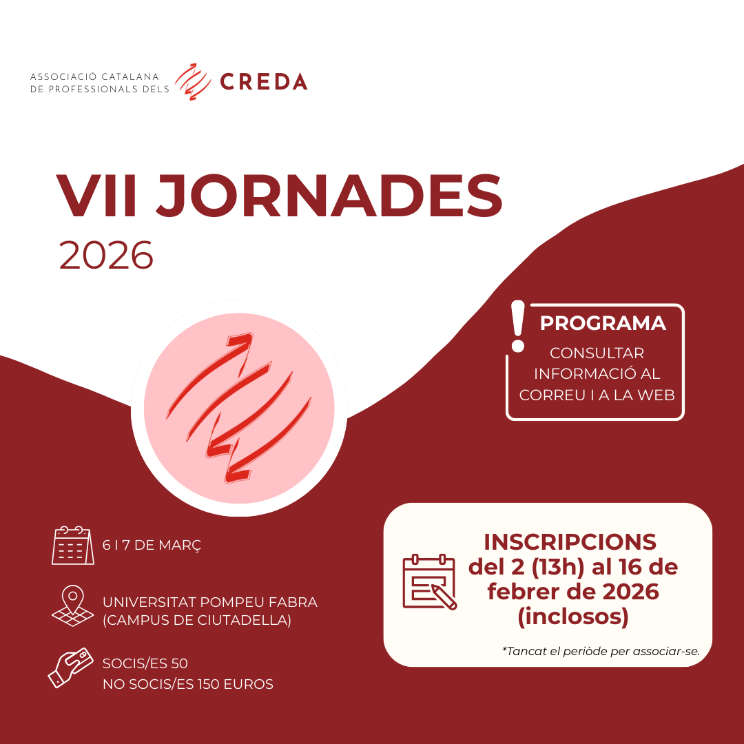 L’Associació Catalana de Professionals dels CREDA (ACPCREDA) està organitzant les VII Jornades de Formació, que se celebraran els dies 6 i 7 de març de 2026 al Campus de la Ciutadella de la Universitat Pompeu Fabra (Barcelona).