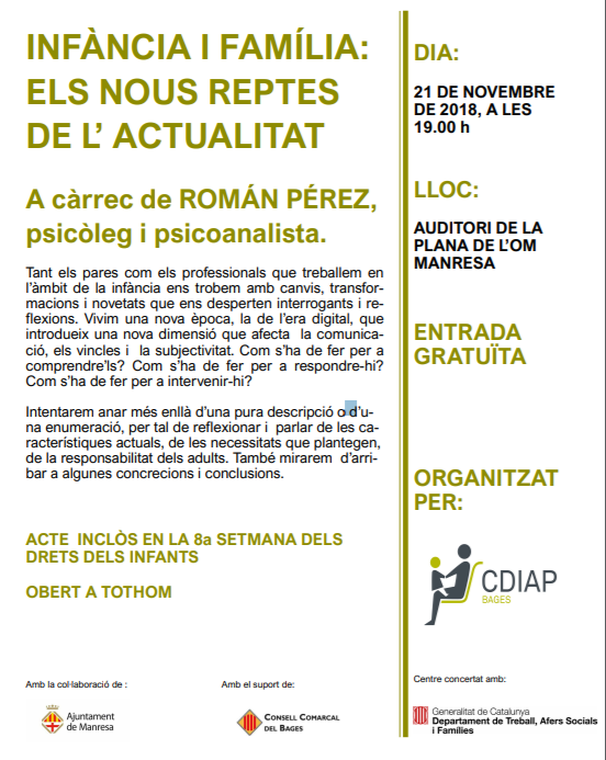 Des del CDIAP del Bages organitzen la conferència Infància i família: els nous reptes de l’actualitat, a càrrec de Román Pérez, psicòleg i psicoanalista. Tindrà lloc el dimecres 21 de novembre, a les 19:00 h a l’Auditori de la Plana de l’Om de Manresa.