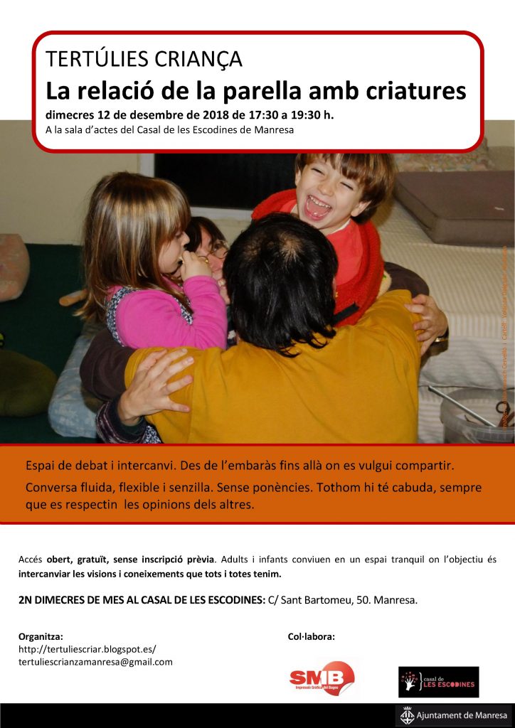 La relació de la parella amb criatures On queda la parella després de tenir criatures? Ens reservem moments per a compartir més enllà de l’intercanvi d’informació? Com cerquem els moments d’intimitat? Parlarem de com ho viu cadascú i compartirem idees. Dia 12 de desembre de 17:30 a 19:30 Casal de les Escodines     Activitats