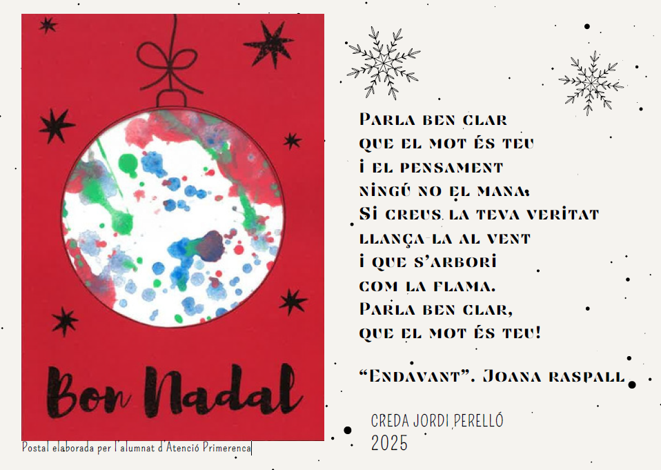 Des del CREDA us desitgem un Bon Nadal i millor 2026!!! Compartim amb vosaltres aquesta postal elaborada per l’alumnat d’Atenció Primerenca i amb unes paraules de la Joana Raspall. PARLA BEN CLAR QUE EL MOT ÉS TEU I EL PENSAMENT NINGÚ NO EL MANA. SI CREUS LA TEVA VERITAT LLANÇA-LA AL VENT I QUE S’ARBORI COM LA […]