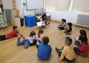 Després, vam començar la sessió explicant el conte: “El lleó i el ratolí”. Per introduir el conte, vam ensenyar-los una capsa i els hi vam dir que a dins s’amagaven dos animals. Vam estar parlant de quins animals podrien ser i els hi vam donar pistes per a què els endevinèssin. Finalment, ho van aconseguir. A dins de la capsa, van trobar un lleó i un ratolí de peluix. Després, vam explicar el conte i tots van estar molt atents, fent inferències, contestant les preguntes que els hi feiem, etc. A veure si us expliquen el conte!!