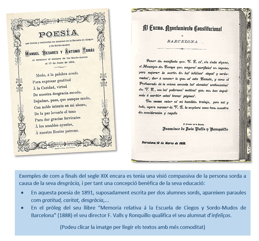 En aquell temps es considerava les persones sordes “desgraciades” (que patien una desgràcia) i “miserables” (que eren dignes de misericòrdia), i així eren qualificades en els textos de l’època. La seva educació es reduïa gairebé a l’ensenyament del catecisme amb la finalitat -com havia dit l’Abbé de l’Épée- que “no visquessin i morissin en la ignorància de la seva religió”, condició necessària, semblava, per poder anar al cel.