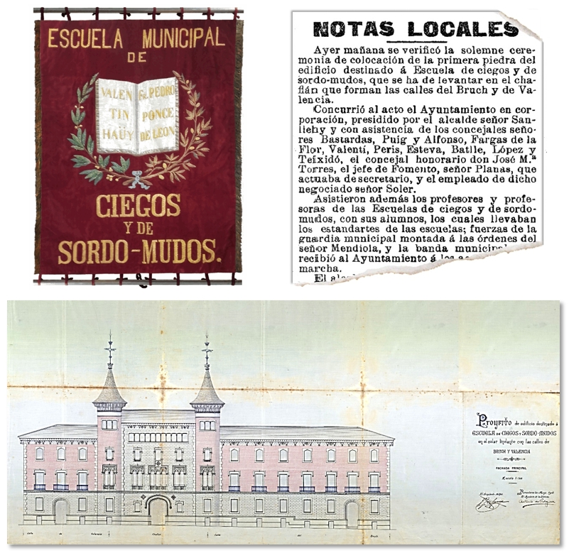 L’article de La Vanguardia del 11/11/1907 informa de la col·locació de la primera pedra de l’edifici (10/11/1907) que havia de ser la futura Escola Municipal de Cecs i Sords-Muts, amb entrada per la cantonada dels carrers Bruc i València. Hi van assistir l’alcalde, els regidors, el professorat i l’alumnat, que portava el pendó de l’escola, així com la banda municipal i la Guàrdia Urbana muntada a cavall. L’acta corresponent, signada pels assistents, es va inserir en un tub de vidre dins un forat d’aquella primera pedra, que es va col·locar a la cantonada del carrer València. Encara deu ser allà com a fals testimoni del que havia de ser, ja que el Consistori va canviar d’idea i el singular edifici es va destinar finalment a la seu del Conservatori de Música, seguint condemnant l’alumnat sord a una nova itinerància de més de 60 anys d’edifici en edifici no sempre en condicions adequades. Cliqueu aquesta frase si voleu llegir l’article complet.
