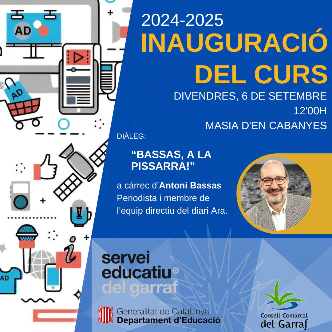 L’acte d’inauguració del curs 2024-2025 que hem organitzat des del Servei Educatiu del Garraf en col·laboració amb el Consell Comarcal tindrà lloc aquest divendres, 6 de setembre, de 12 a 14 h, a la Masia d’en Cabanyes. Durant l’acte, a més de presentar les novetats d’aquest curs, comptarem amb la intervenció d’Antoni Bassas, periodista i membre de l’equip directiu del diari Ara que ens aportarà la seva visió sobre l’educació actual, a partir de la seva experiència com a alumne i com a pare. Un diàleg amb to positiu i engrescador entre el periodista i les persones assistents per tal de donar la benvinguda al curs.