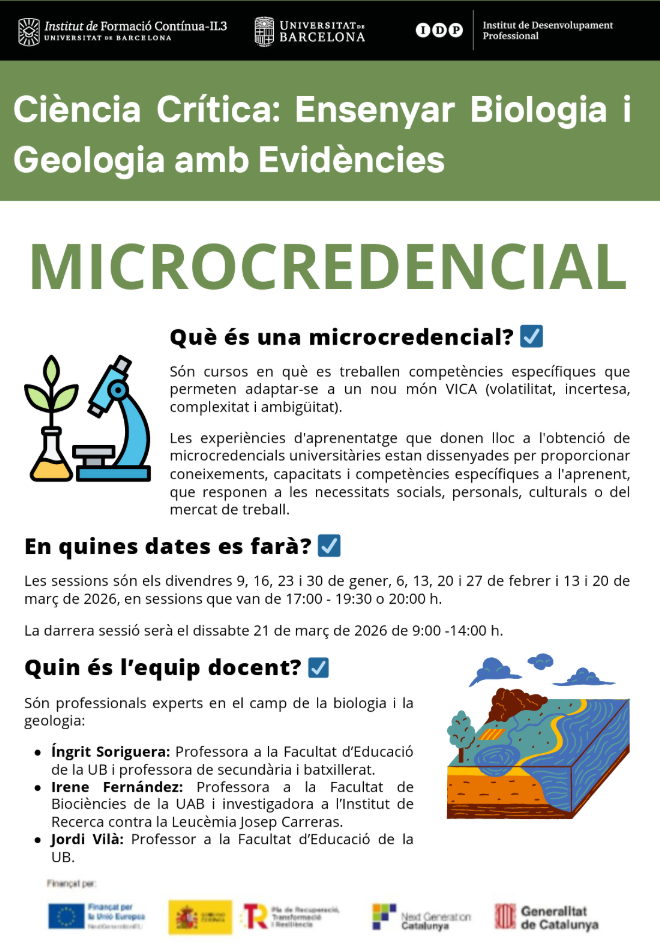 Des de l’Institut de Desenvolupament Professional (IDP) de la Universitat de Barcelona hem preparat quatre microcredencials adreçades a docents i altres professionals, amb l’objectiu d’oferir formació flexible i reconeguda en competències clau dins l’espai europeu.