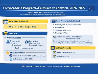 S’ha obert la convocatòria perquè els centres educatius puguin sol·licitar la participació en el Programa d’Auxiliars de Conversa per al curs 2026-2027, iniciativa impulsada pel Departament d’Educació i Formació Professional en col·laboració amb el Ministeri d’Educació, Formació Professional i Esports i la Unió Europea.