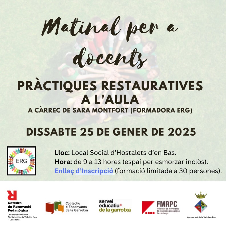 ATENCIÓ! Publicada tota l’oferta formativa que tindrà lloc de febrer a maig de 2025. Podeu fer les inscripcions del 7 al 15 de gener de 2025. Les adjudicacions les podreu consultar a partir del 31 de gener a la pàgina Les meves activitats. Llista d’activitats del CRP de la Garrotxa. Per realitzar la inscripció a les