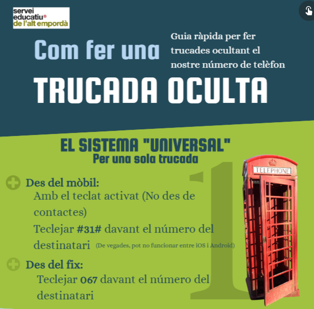 Us compartim el pòster que han fet els nostres companys del SE de l’Alt Empordà on s’explica com fer trucades ocultes des d’un telèfon fix i des d’un mòbil Android i iOs. Esperem que sigui de la vostra utilitat.