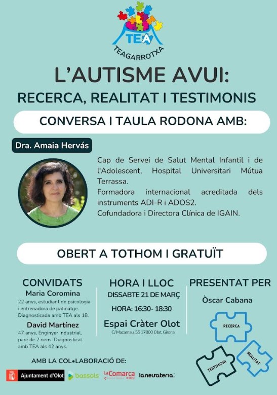 En aquesta jornada se celebrarà una conversa i una taula rodona sobre L’ Autisme avui: recerca, realitat i testimonis amb la Dra. Amaia Hervés, cap de Servei de Salut Mental Infantil i de l’Adolescent de l’hospital Universitari Mútua Terrassa que es va especialitzar en psiquiatria d’adults al Saint George’s Hospital (Londres) i posteriorment en psiquiatria Infanto-Juvenil a l’Institute of Psychiatry-Maudsley Hospital (Londres). Actualment, participa en estudis de recerca nacionals i internacionals d’epidemiologia i de genètica a TDAH i TEA i té diverses publicacions internacionals rellevants en aquestes àrees.