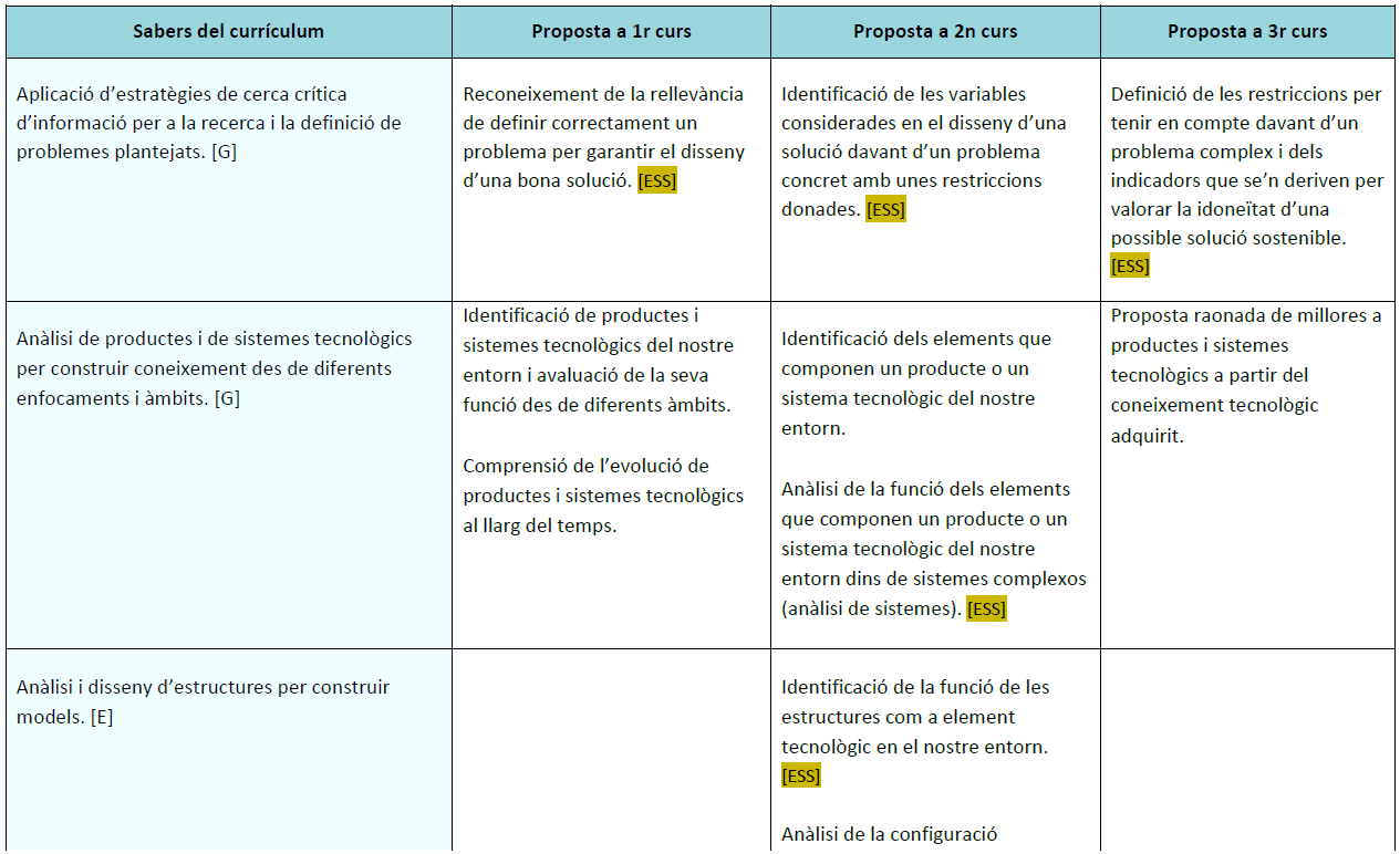 En les taules s’indiquen amb l’etiqueta [ESS] aquells sabers que es consideren essencials, és a dir, que és necessari aprendre’ls per poder seguir avançant en els sabers posteriors de la matèria.