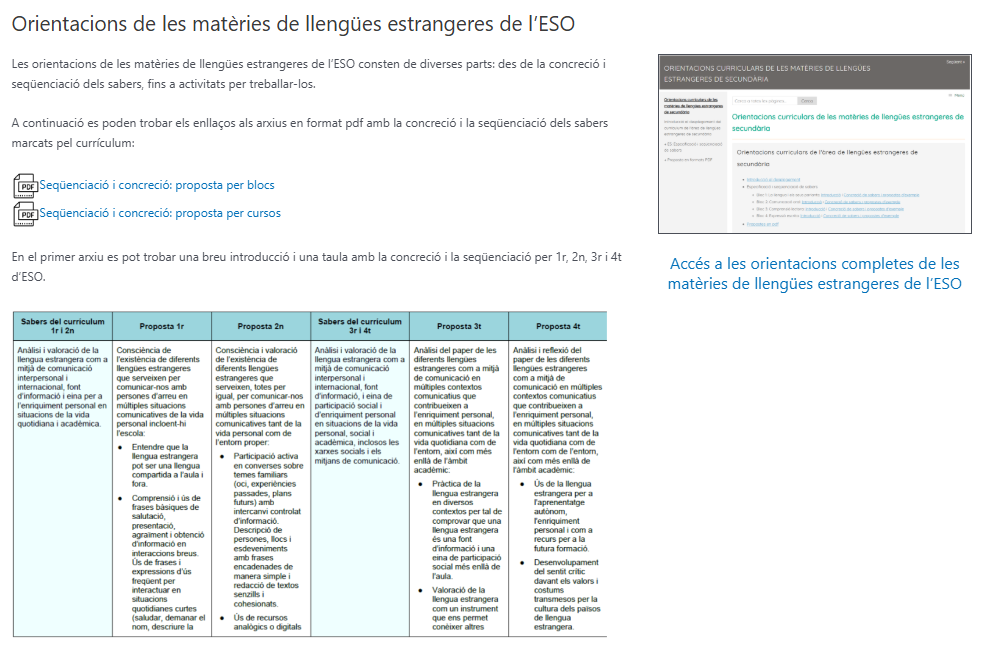 Les orientacions de les matèries de llengües estrangeres de l’ESO consten de diverses parts: des de la concreció i seqüenciació dels sabers, fins a activitats per treballar-los.