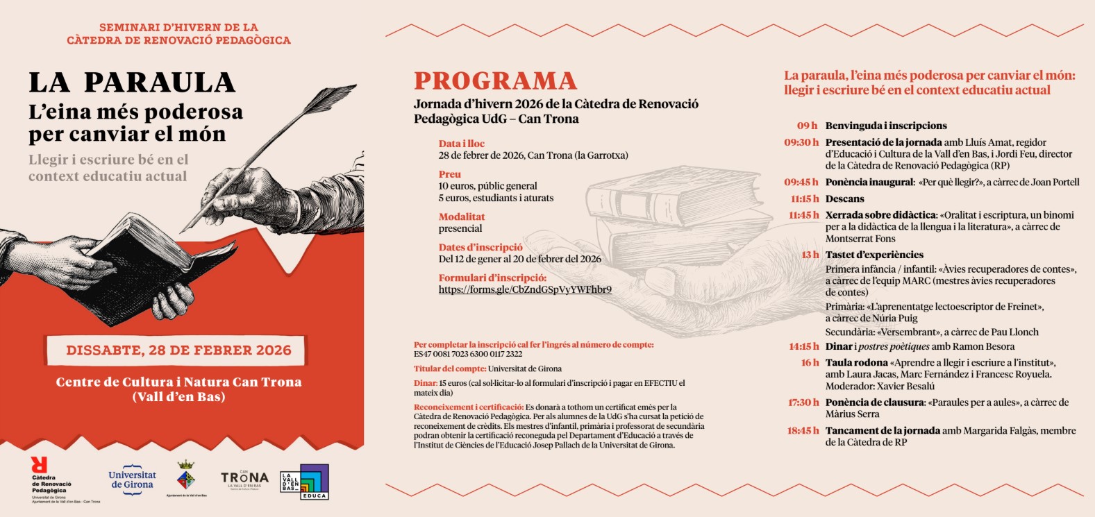 En el marc de la Càtedra de Renovació Pedagògica UdG – Can Trona hem organitzat la cinquena Jornada d’Hivern: La paraula, l’eina més poderosa per canviar el món: Llegir i escriure bé en el context educatiu actual