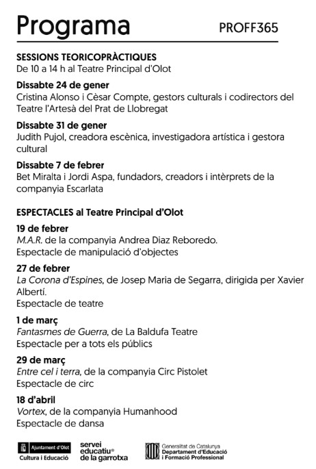 La formació consta de tres sessions formatives i es complementarà amb l’assistència a cinc espectacles al Teatre Principal d’Olot amb una xerrada o activitat abans i després de cada funció.