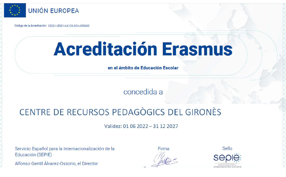 Les Acreditacions Erasmus són adjudicades pel Servicio Español para la Internacionalización de la Educación (SEPIE) i la concessió d’aquesta acreditació, com a centre coordinador, permetrà organitzar al CRP del Gironès nombroses mobilitats a Europa per als docents i l’alumnat dels diferents centres de Primària i Secundària participants, impulsant aquesta manera, la internacionalització de la nostra zona.