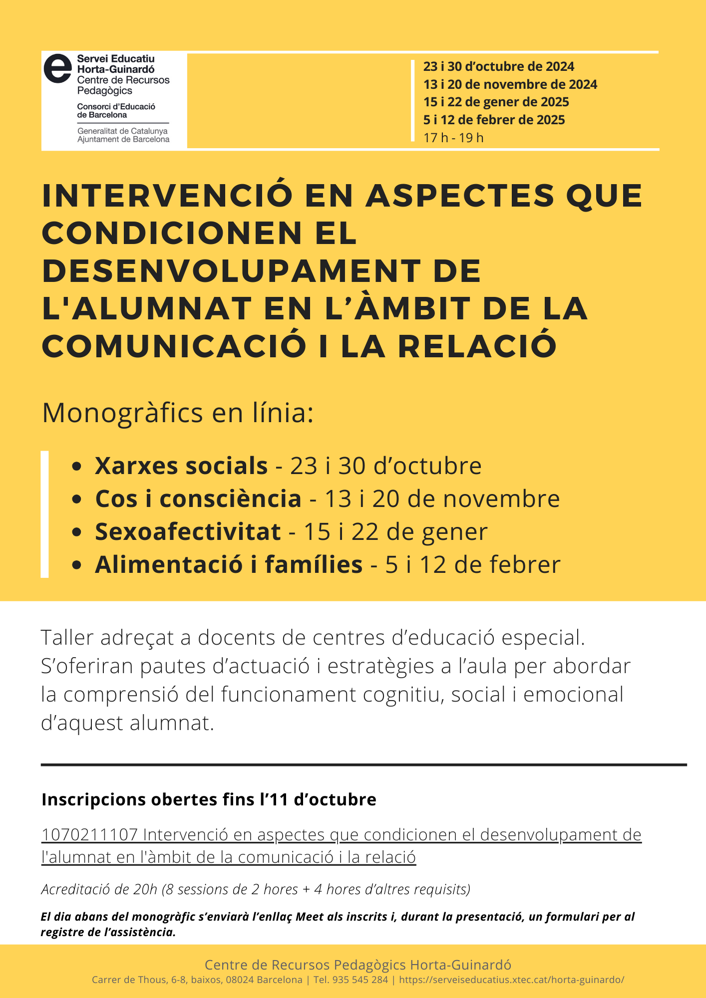 L’assistència als quatre monogràfics certificarà 20h de formació. La inscripció romandrà oberta fins el 21 d’octubre.