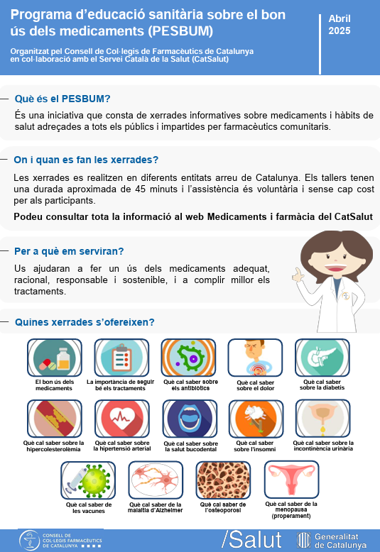 El Programa d’Educació Sanitària pel Bon Ús dels Medicaments (PESBUM) és una iniciativa impulsada pel CatSalut i el Consell de Col·legis de Farmacèutics de Catalunya. Ofereix xerrades gratuïtes impartides per farmacèutics comunitaris, adreçades a tota la població, amb l’objectiu de millorar el coneixement sobre els medicaments i afavorir un ús responsable i efectiu.