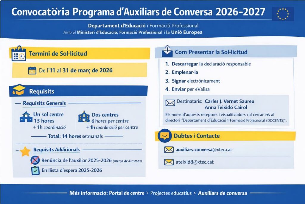 Us informem que s’ha obert la convocatòria perquè els centres educatius puguin sol·licitar la participació en el Programa d’Auxiliars de Conversa per al curs 2026-2027, iniciativa impulsada pel Departament d’Educació i Formació Professional en col·laboració amb el Ministeri d’Educació, Formació Professional i Esports i la Unió Europea.