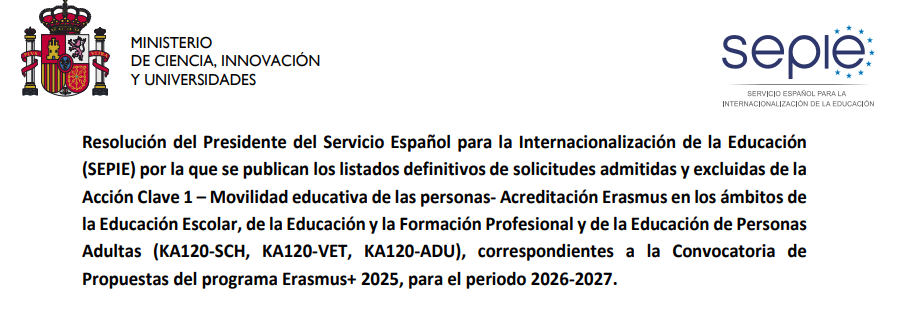 Ja s’ha publicat la Resolució amb els llistats definitius de sol·licituds admeses i excloses de l’Acció Clau 1 – Mobilitat educativa de les persones – Acreditació Erasmus en els àmbits de l’Educació Escolar, de l’Educació i la Formació Professional i de l’Educació de Persones Adultes (KA120-SCH, KA120-VET, KA120-ADU), corresponents a la Convocatòria de Propostes del programa Erasmus+ 2025, per al període 2026-2027.