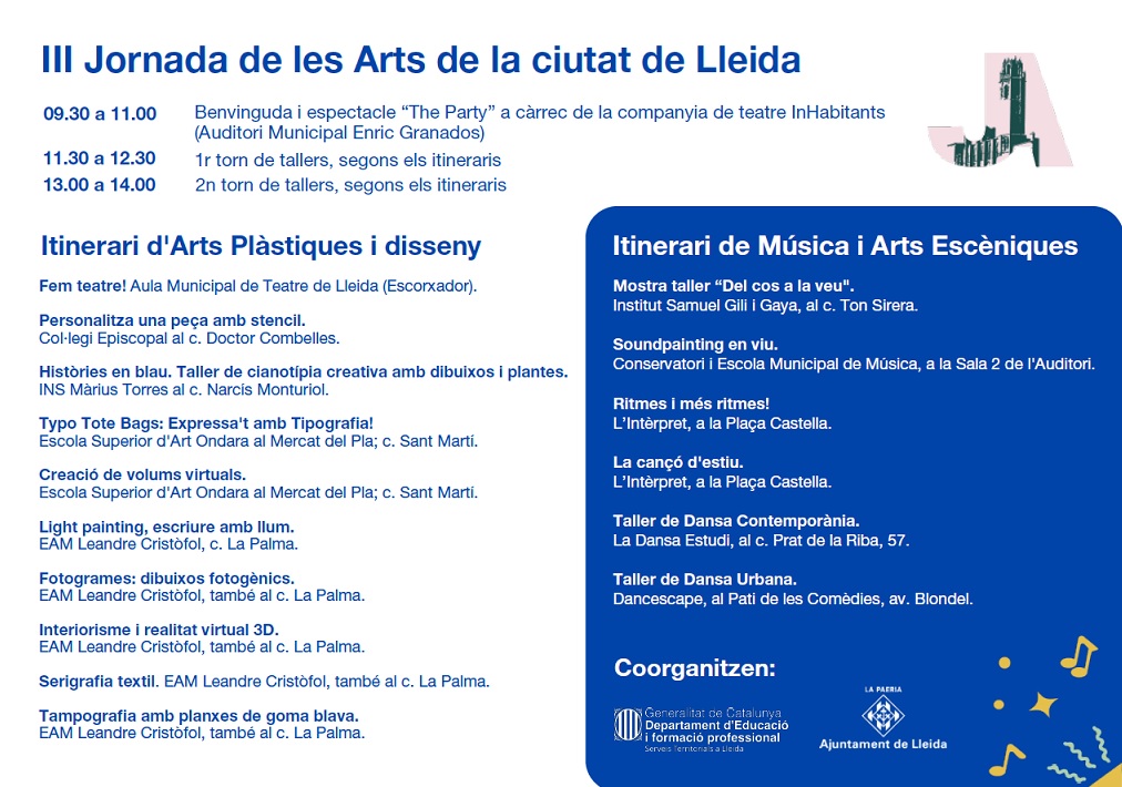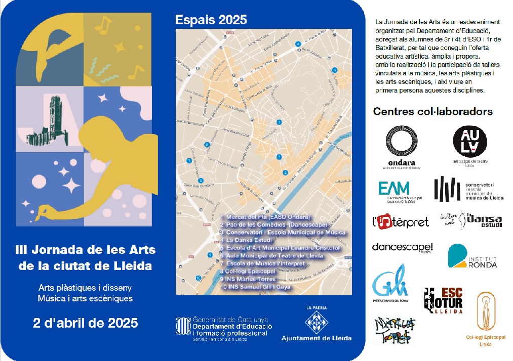 És un vertader plaer per a la secció dels Serveis Educatius del Departament d’Educació i FP a Lleida presentar-vos el programa i el cartell de la 3a edició de la Jornada de les Arts de la Ciutat de Lleida adreçat a l’alumnat dels centres educatius de la nostra ciutat que actualment cursen des de 3r d’ESO fins a 1r de Batxillerat.