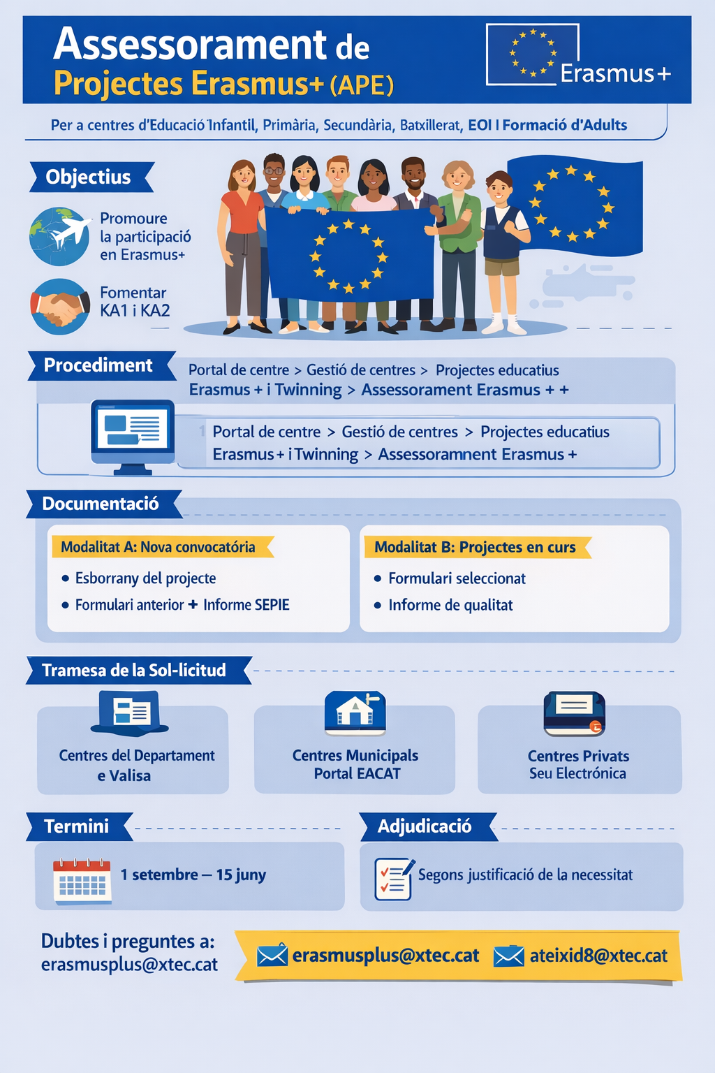 Us recordem que el Departament d’Educació i Formació Professional, a través de la Subdirecció General de Llengües, posa a disposició dels centres sostinguts amb fons públics el servei d’assessorament de projectes Erasmus+ (APE).