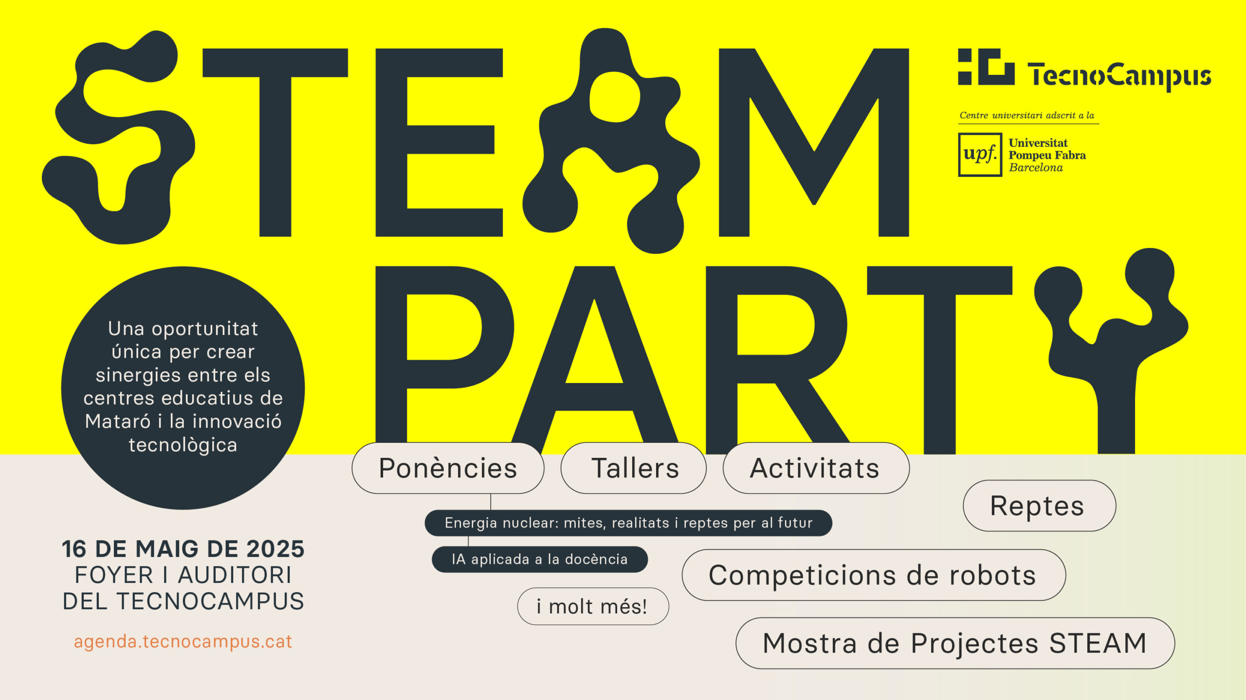 El pròxim 16 de maig es durà a terme la STEAM PARTY 2025  a les instal·lacions del Tecnocampus de Mataró. Durant la tarda, us convidem a participar en dues interessants activitats formatives gratuïtes adreçades a tots aquells qui tingueu interès a aprofundir sobre la tecnologia a l’aula.