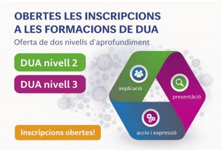 Ja estan disponibles les noves formacions de Disseny Universal per a l’Aprenentatge (DUA) adreçades als professionals de l’àmbit educatiu que volen aprofundir en aquest marc per avançar cap a pràctiques educatives més inclusives. L’oferta formativa inclou dos nivells d’aprofundiment, amb activitats certificades de 30 hores que combinen treball autònom i 5 sessions síncrones de 2,5 hores.