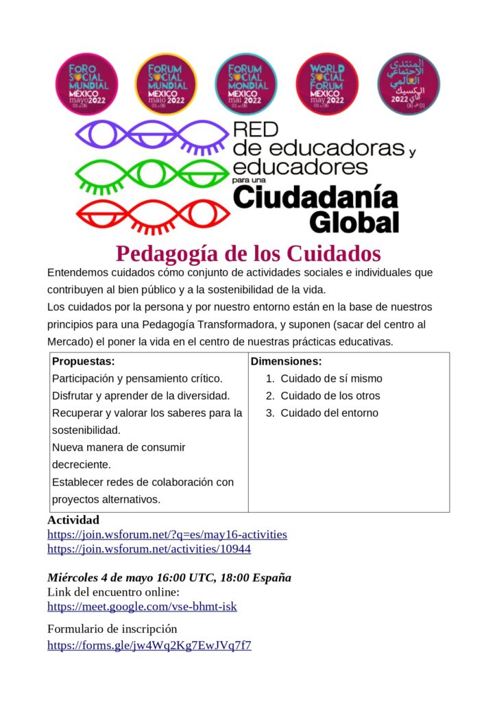 Presentació del treball de les Xarxes d’Educadors per a una Ciutadania Global al voltant de la Pedagogia de les Cures Feu un comentari / Per admin / 03/05/2022 / Formació General Inici Portada Dimecres 4 a les 18h tindrà lloc la presentació del treball de les Xarxes d’Educadors per a una Ciutadania Global al voltant de la Pedagogia de les Cures, dins el Fòrum Social Mundial.