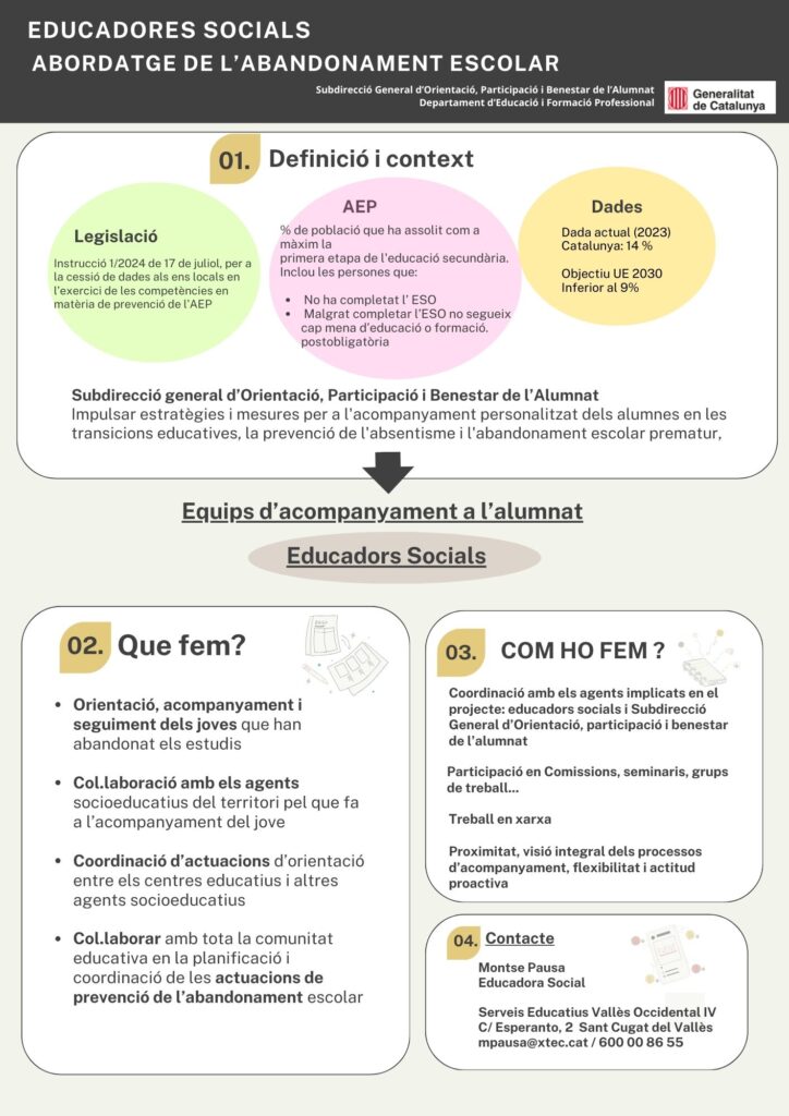 Des del passat mes d’octubre, els Serveis Educatius del Montsià, ja compta amb un nou educador social que serà el referent del Departament d’Educació en matèria d’abandonament, i que treballa de manera conjunta i coordinada amb altres agents i professionals de la xarxa socioeducativa del municipi i els centres educatius