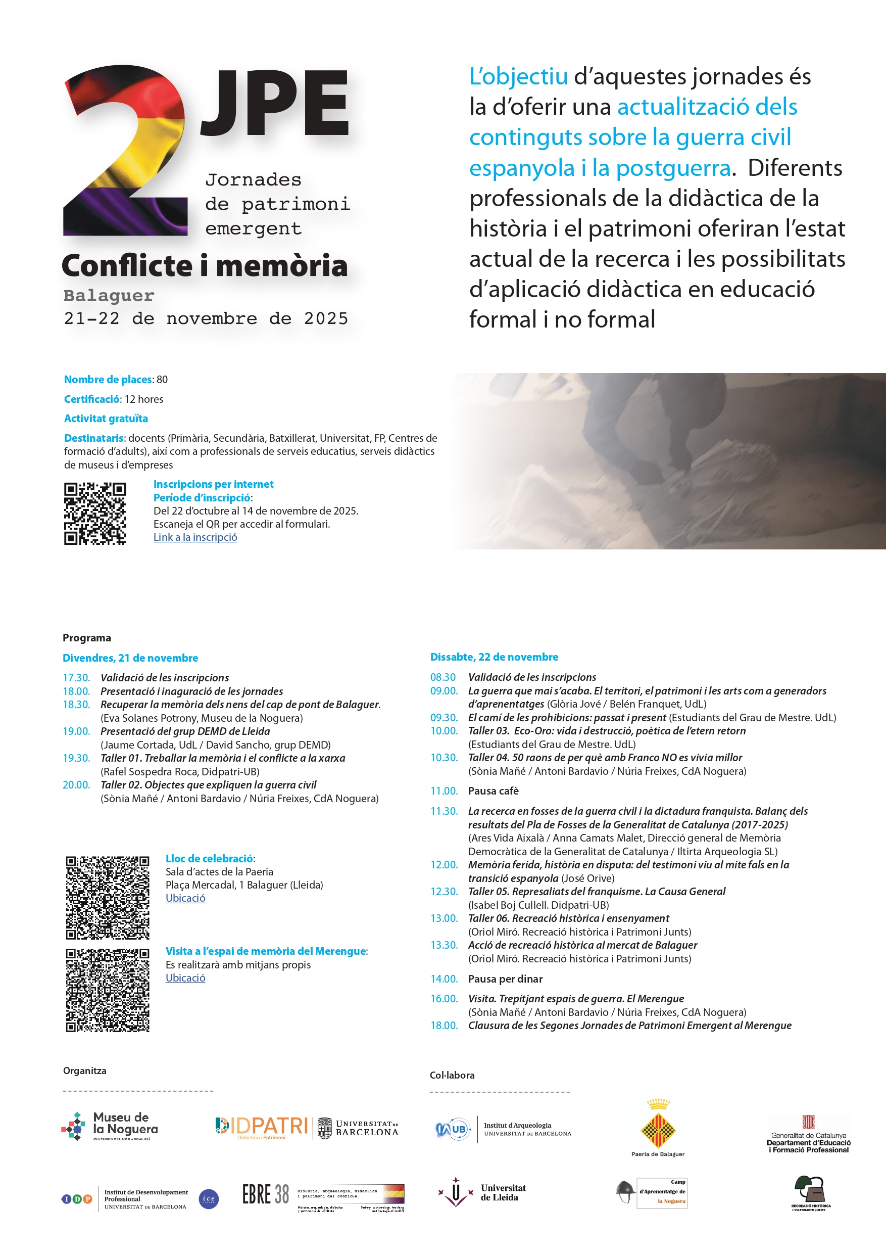 Els dies 21 i 22 de novembre tenen lloc les jornades “Conflicte i memòria”, a Balaguer. L’objectiu d’aquestes jornades és la d’oferir una actualització dels continguts sobre la guerra civil espanyola i la postguerra. Diferents professionals de la didàctica de la història i el patrimoni oferiran l’estat actual de la recerca i les possibilitats d’aplicació didàctica en educació formal i no formal.