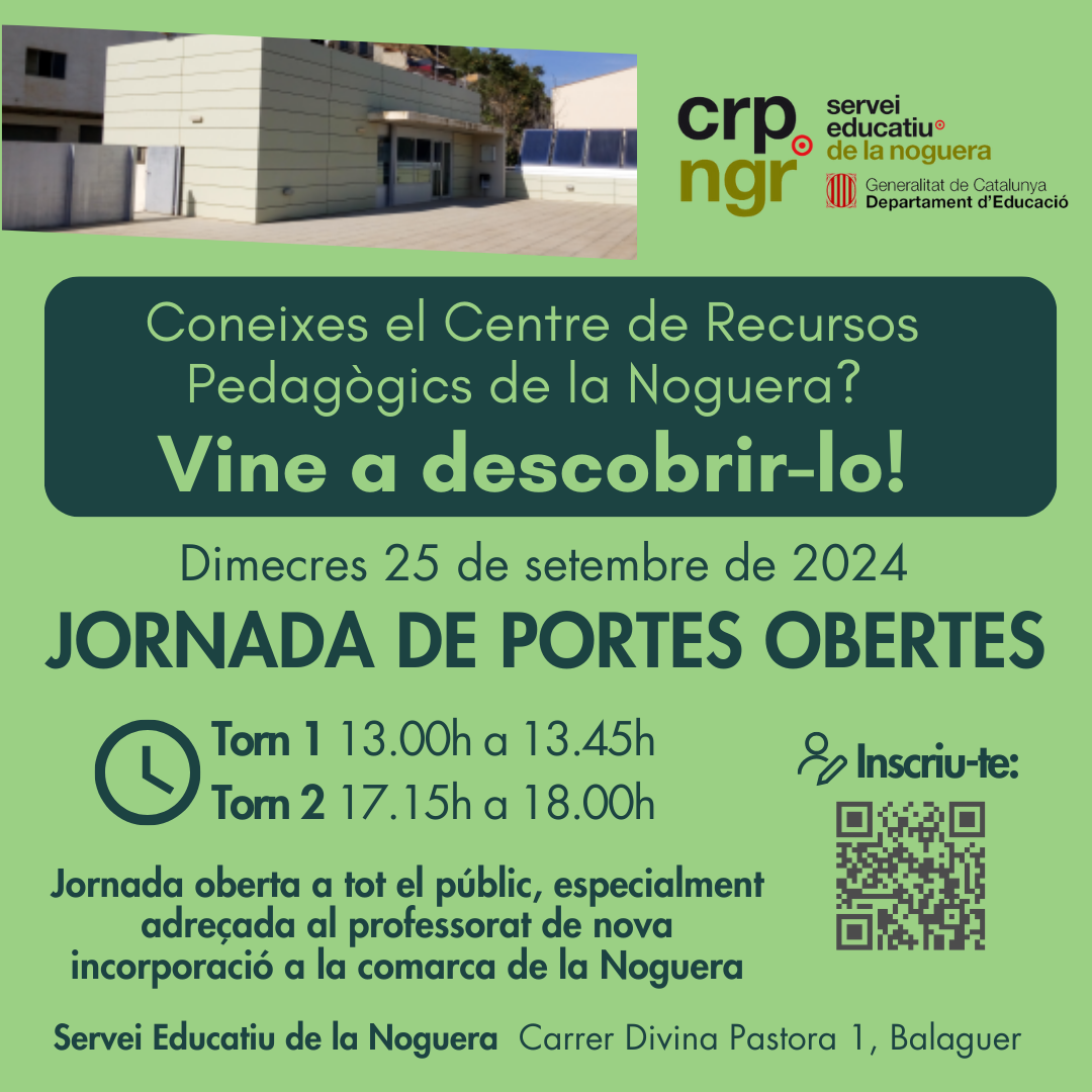 Amb la idea d’oferir suport a l’acompanyament del professorat de nova incorporació a la comarca, i també de recordar les funcions i possibilitats que ofereix el CRP, el dia 25 de setembre tindrà lloc una jornada de Portes Obertes del CRP de la Noguera. Hi haurà dos torns (12.45h i 17.15h), i és obert al públic en general, tot i que s’adreça especialment al professorat que s’ha incorporat als centres de la Noguera els darrers cursos.